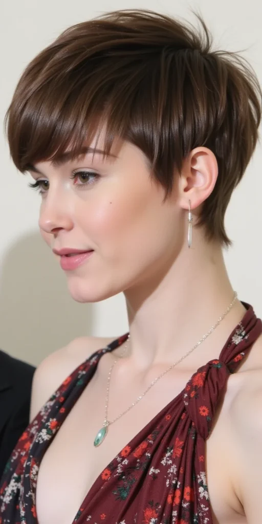The wispy side fringe with messy pixie combines structured precision cutting with deliberately tousled texture for effortless sophistication.