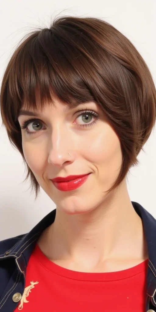 Blunt micro bangs paired with a pixie cut create a bold, editorial-inspired look that demands attention.