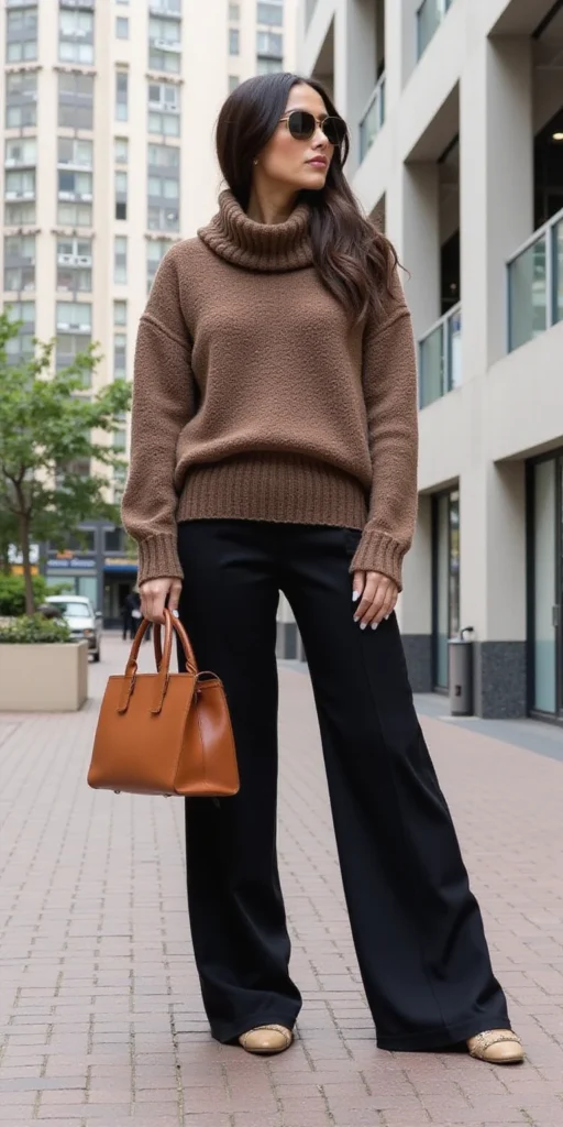 The oversized turtleneck paired with wide-leg trousers creates an effortlessly chic combination that balances comfort with sophistication.