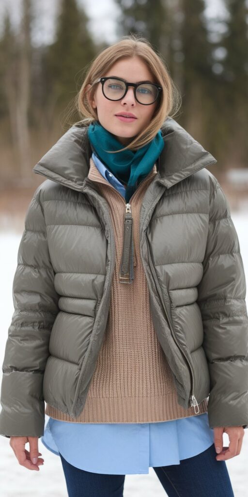 The contrast between voluminous outerwear and streamlined underlayers creates visual interest while ensuring you stay warm. This styling technique transforms an oversized puffer from casual wear into a chic statement piece suitable for various occasions.