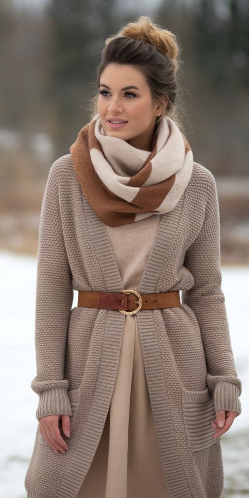 Long cardigans provide an elegant layering foundation that pairs beautifully with strategic scarf styling for cold-weather sophistication.
