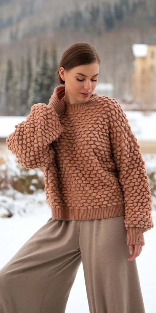 Textured sweaters paired with wide-leg pants create an effortlessly chic silhouette that balances comfort with fashion-forward style. The combination of cable knits, ribbed surfaces, or chunky weaves adds visual interest while providing essential warmth.