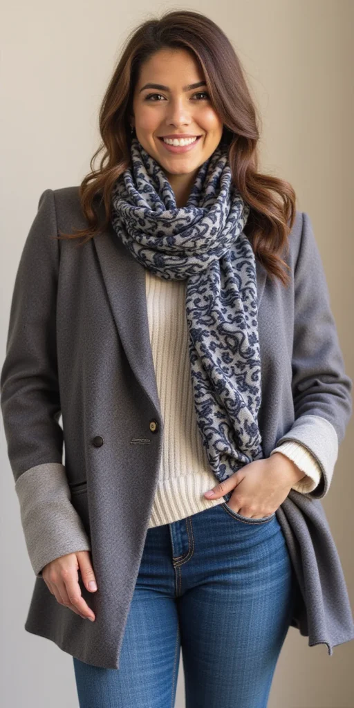 This versatile outfit works perfectly for transitioning from casual daytime activities to more polished evening occasions. The contrast between the blazer’s relaxed silhouette and the jeans’ tailored fit flatters various body types.