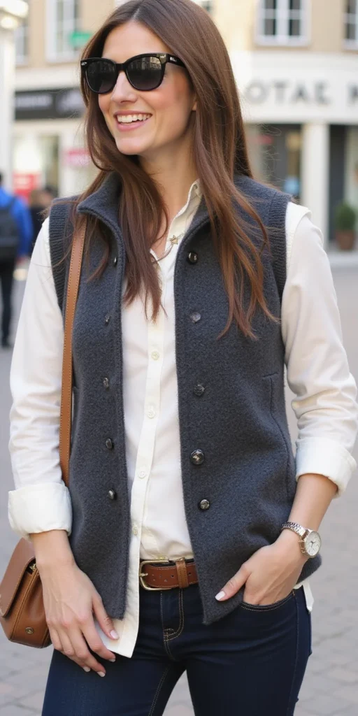 The wool sweater vest layered over a button-down shirt creates a sophisticated look that seamlessly transitions between professional and casual settings.