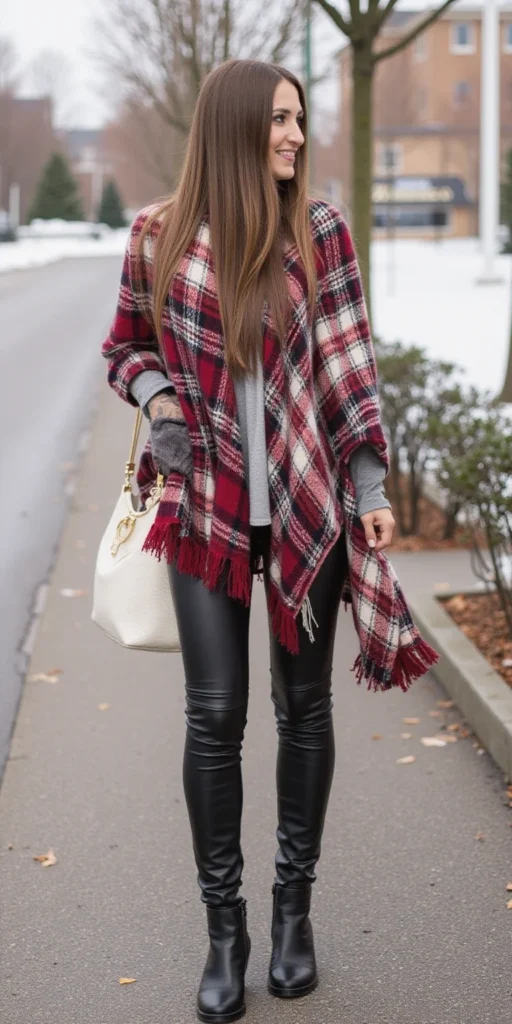 A cashmere poncho paired with leather leggings creates an effortlessly chic winter ensemble that balances luxury with modern edge.