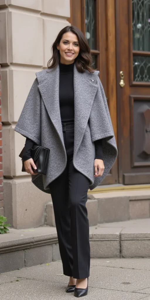Complete the look with high-waisted wool trousers in a coordinating shade. The contrast between the cape’s fluid drape and the turtleneck’s fitted silhouette creates visual interest that’s thoroughly contemporary.