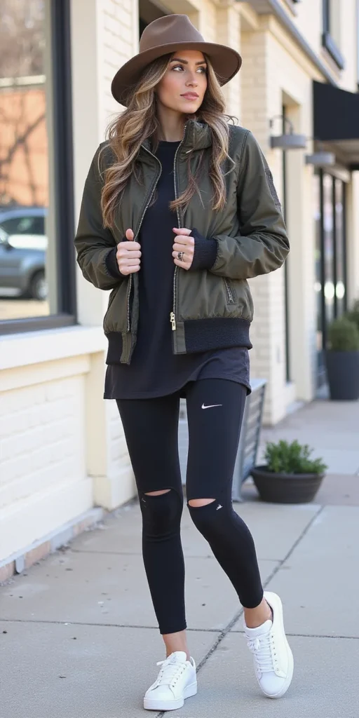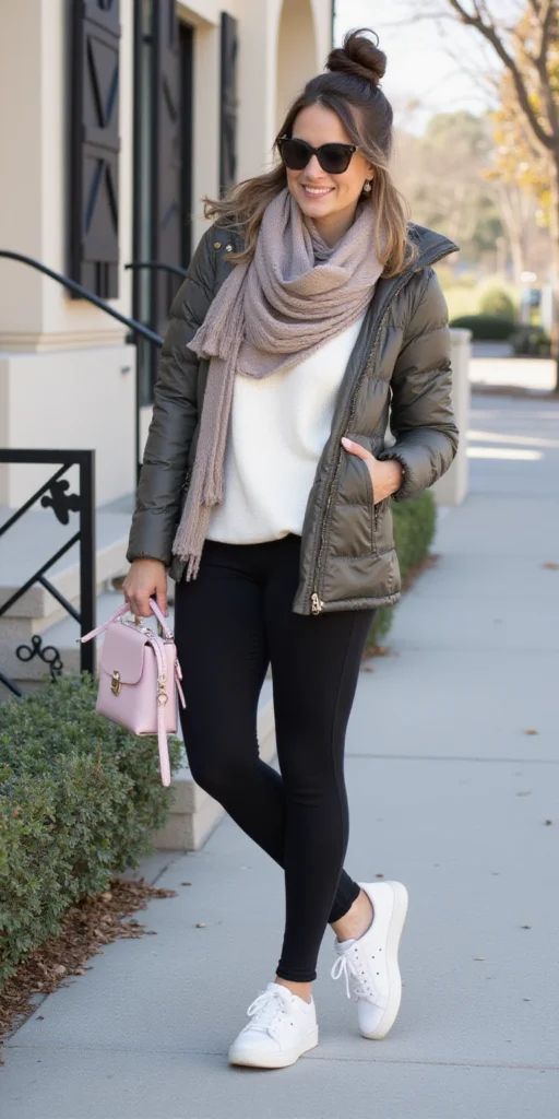 The puffer jacket paired with leggings and sneakers creates the perfect athleisure ensemble for winter’s most casual moments.