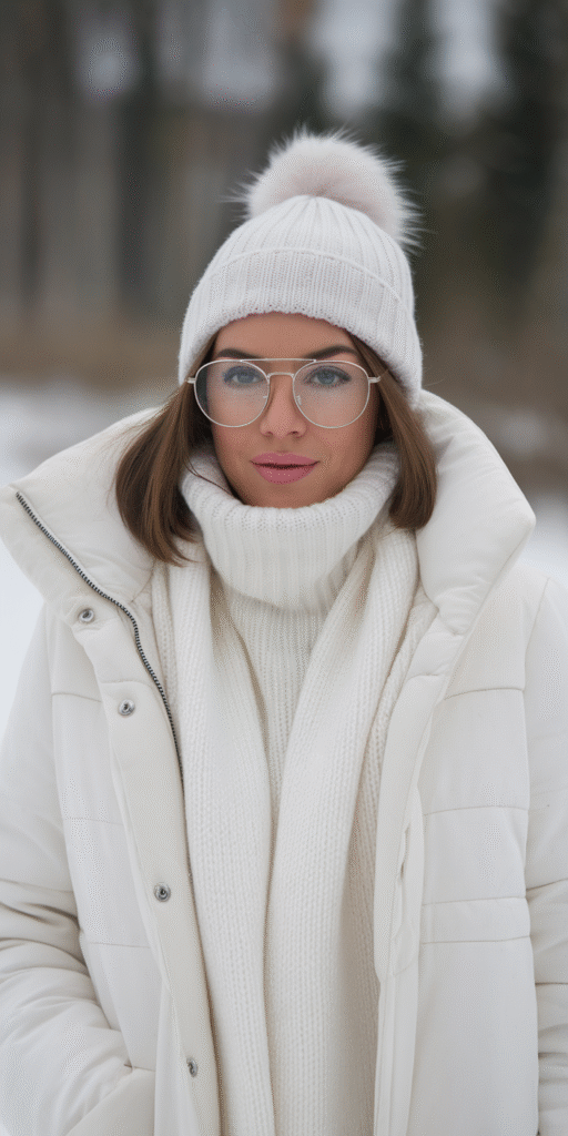 A monochromatic winter white outfit creates sophisticated elegance through varying shades and textures rather than contrasting colors.
