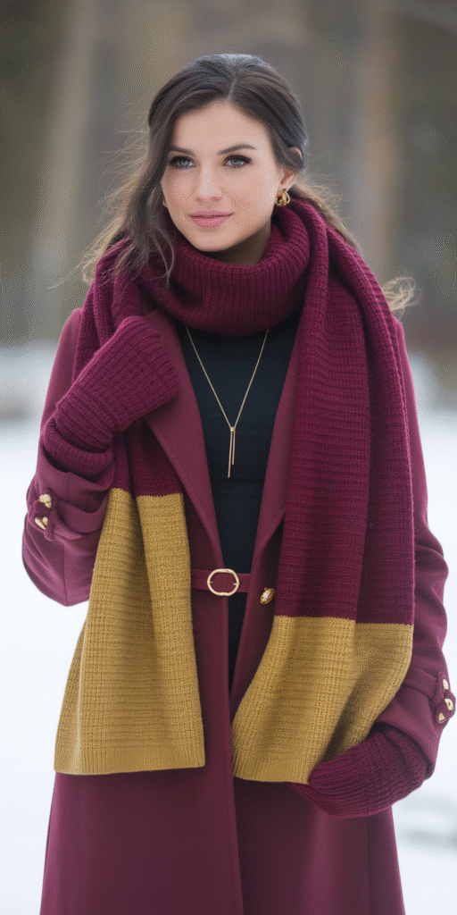 Complete the ensemble with burgundy accessories like leather gloves, a structured handbag, or ankle boots in matching wine tones. The key is balancing these opulent colors without overwhelming your silhouette.