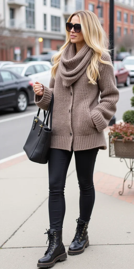 Oversized sweaters and chunky cardigans paired with sleek leather combat boots offer versatility for both weekend outings and relaxed office environments.
