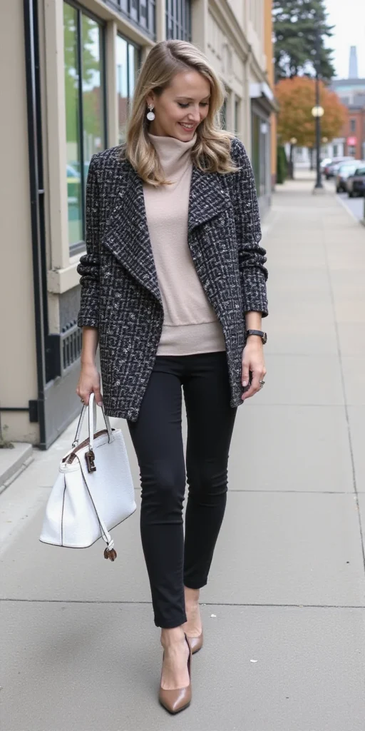 Choose blazers with defined shoulders and tailored waists in rich jewel tones like emerald or burgundy. Pair with close-fitting turtlenecks and midi skirts in A-line or pencil cuts for versatility.
