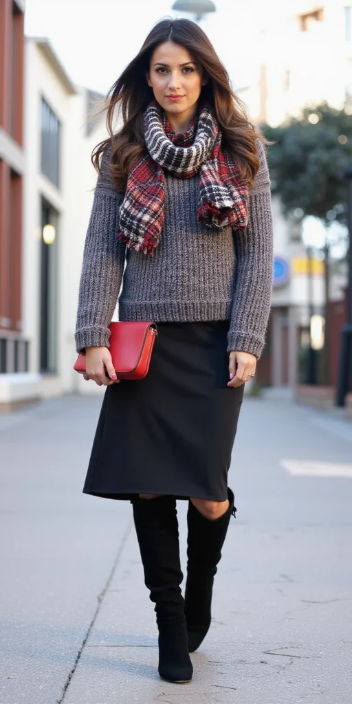 Select a fitted chunky knit in neutral tones like camel, charcoal, or cream for sophisticated warmth. The midi skirt should fall at mid-calf in structured fabrics like ponte knit or wool blends that maintain professional polish.