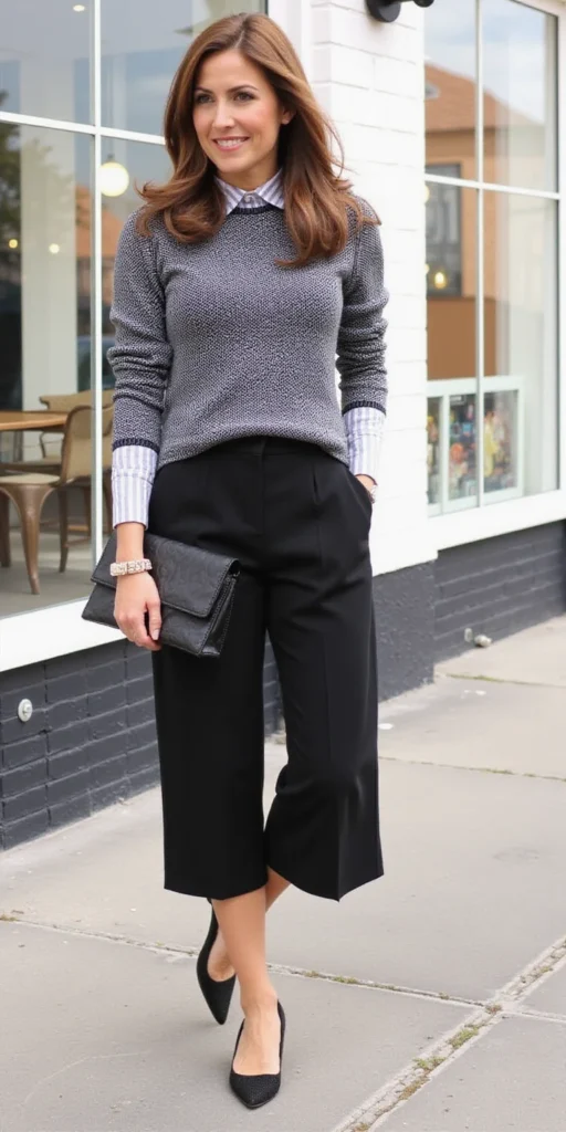 A wool blend sweater paired with culottes creates an effortlessly chic combination that's both professional and comfortable for winter workdays.
