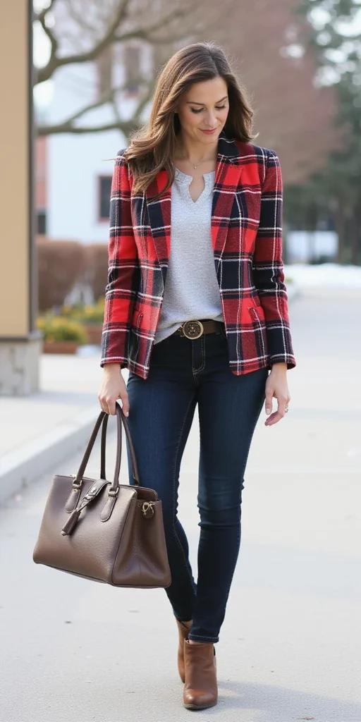 A plaid blazer paired with a thermal henley and dark jeans creates the perfect balance between professional polish and casual comfort.