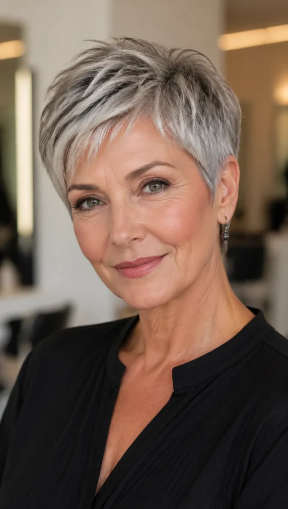 The pixie cut is one of the boldest and most flattering choices for women over 50, instantly lifting facial features and projecting effortless confidence.