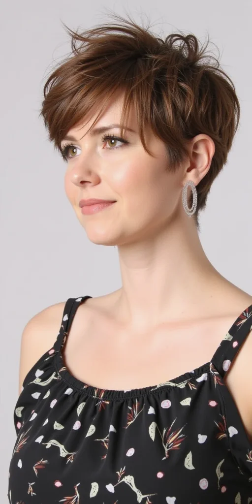 The effortless shaggy pixie bob with air-dried texture offers a perfect styling solution for busy lifestyles that prioritize simplicity without sacrificing professional appearance.