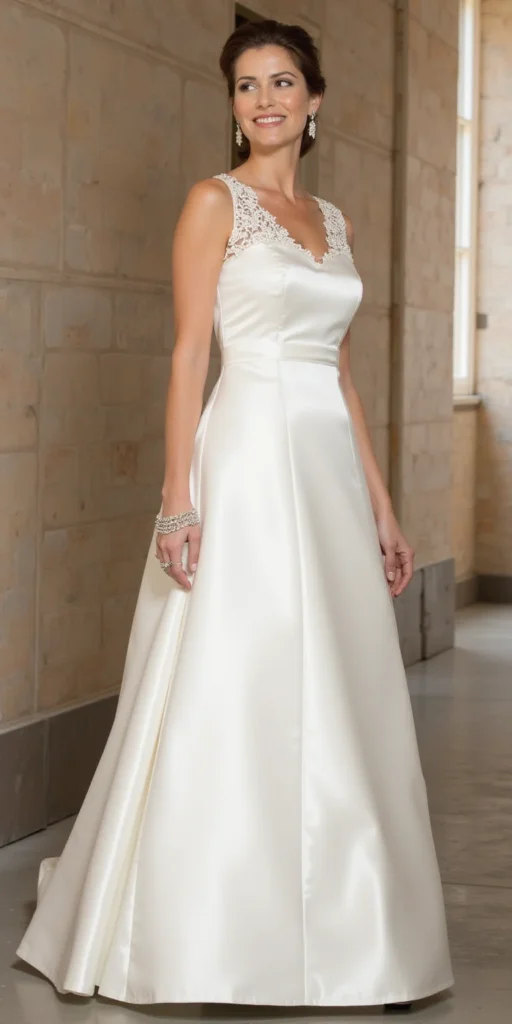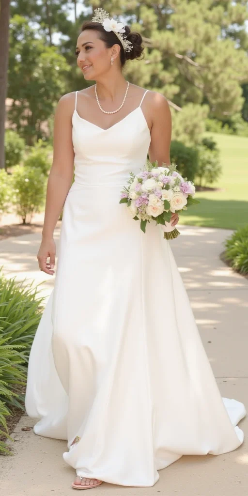 Modern brides embrace this style’s sleek minimalism that allows natural beauty to shine without overwhelming ornamentation. The column silhouette skims the figure gracefully, providing comfort throughout wedding celebrations while maintaining refined elegance. This versatile design adapts seamlessly from intimate ceremonies to grand receptions, making it perfect for today’s discerning bride.