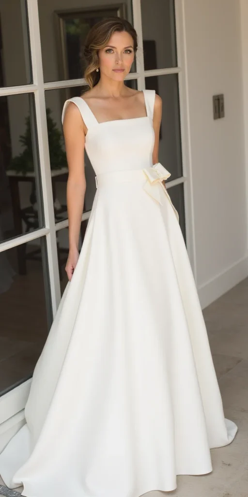 Square necklines offer timeless sophistication through their clean, geometric lines that frame your décolletage beautifully. This architectural approach creates an instantly modern yet classic foundation for your wedding dress.
