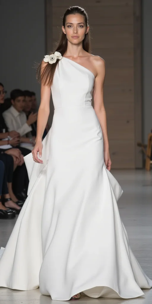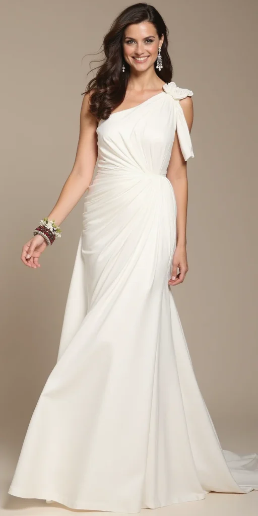 The beauty lies in grecian inspired draping that flows naturally from the single shoulder strap, creating fluid movement with every step. Modern interpretations feature clean lines, luxurious fabrics like silk crepe or chiffon, and minimal embellishment. This style balances drama with simplicity, making it perfect for destination weddings or intimate ceremonies while flattering multiple body types.