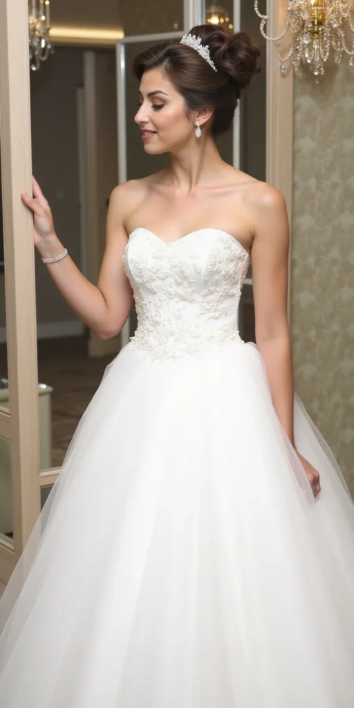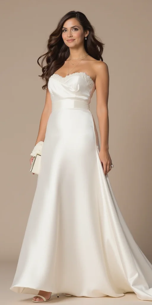 Delicate embroidery along the bodice or scattered throughout the skirt adds subtle sophistication without competing with the gown’s natural elegance. Minimal accessories like simple pearl necklaces or understated earrings complement the strapless neckline beautifully.