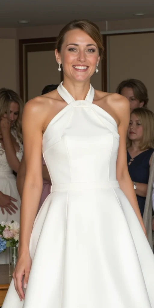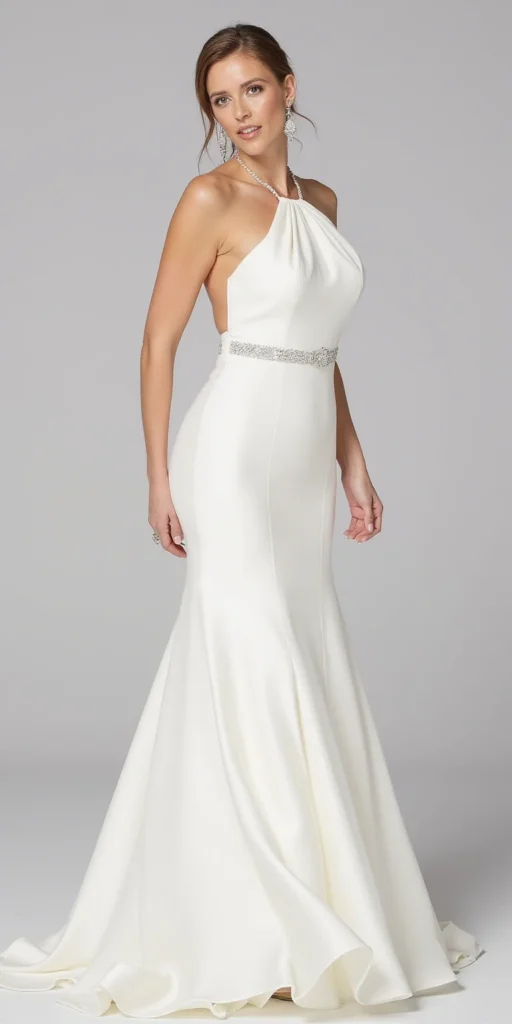 The halter construction provides excellent support while showcasing unadorned fabrics like silk crepe, ponte, or structured satin that drape beautifully on their own. Strategic cutouts, interesting back details, or subtle geometric seaming add visual interest while maintaining the streamlined aesthetic that defines minimalist bridal wear.