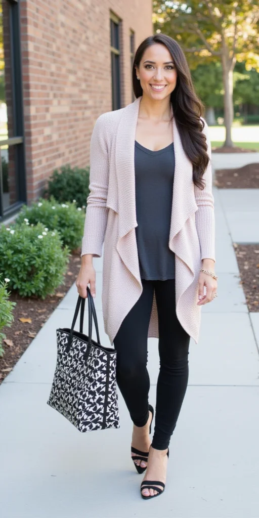The duster cardigan and leggings combination has become the ultimate uniform for busy women seeking both comfort and style. This effortless pairing offers a streamlined silhouette that flatters every body type while providing the flexibility needed for active days. The look transitions seamlessly from morning activities to afternoon errands without compromising on sophistication.