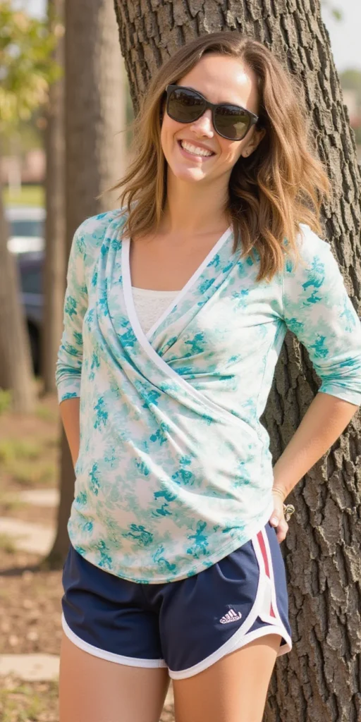 The wrap top and athletic shorts combination offers the perfect balance of style and functionality for active lifestyles. This versatile pairing features breathable fabrics like modal or bamboo blends that maintain their shape while providing comfort during movement. The look transitions seamlessly from athletic activities to casual outings.