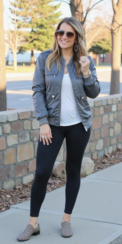 The structured silhouette of a quality bomber jacket instantly elevates basic leggings into a polished, put-together look.