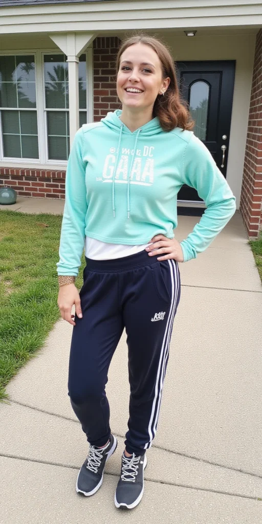Look for stylish accents like contrast piping, subtle logos, or interesting seam details that elevate the athletic aesthetic. Complete the look with clean white sneakers and a crossbody bag. This outfit proves you don’t need to sacrifice style for comfort, creating an effortlessly chic ensemble that’s both practical and fashionable.