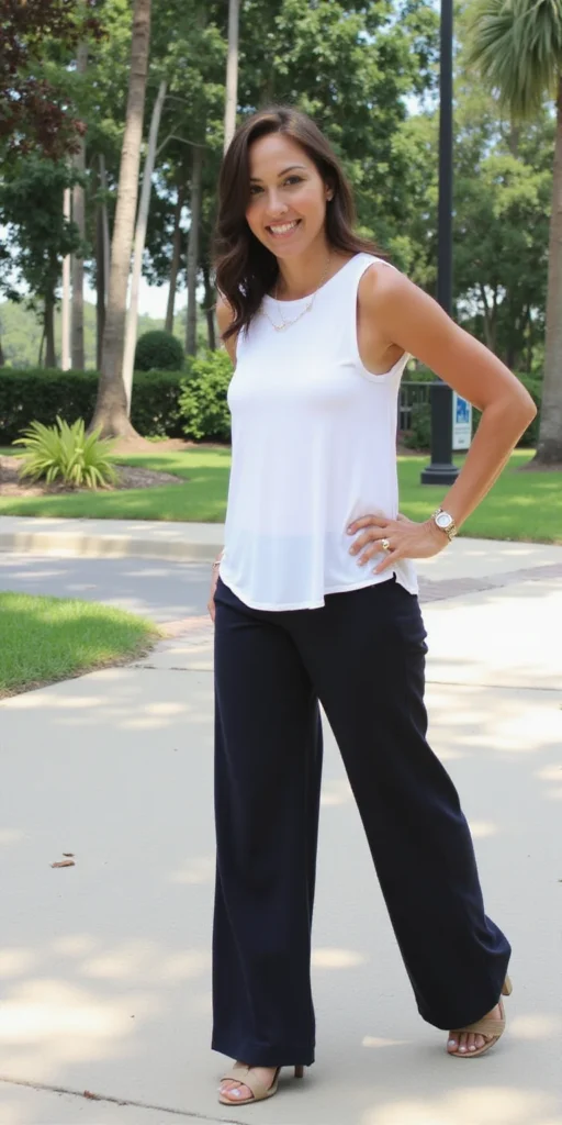 A fitted tank from Lululemon or Athleta prevents bunching during active moments while creating visual contrast against the wide-leg bottoms. Neutral colors like camel, navy, or black ensure maximum versatility for any occasion. Complete the look with minimalist sneakers for an ensemble that transitions effortlessly from sidelines to errands.