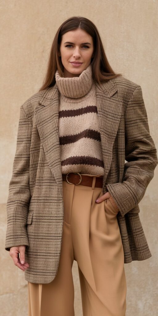 Strategic layering is key to mastering this trend successfully. The oversized blazer provides structure while accommodating bulkier knits underneath, and wide-leg trousers offer flowing movement that elongates the silhouette.