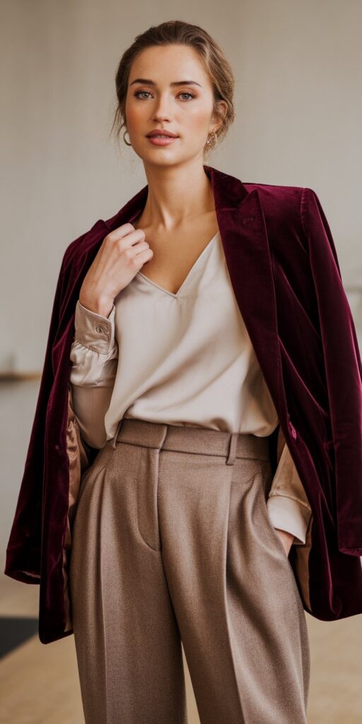 The combination of velvet with silk camisoles and wool trousers delivers perfect fabric contrast while maintaining professional polish. Jewel tones like emerald, sapphire, or burgundy maximize visual impact.