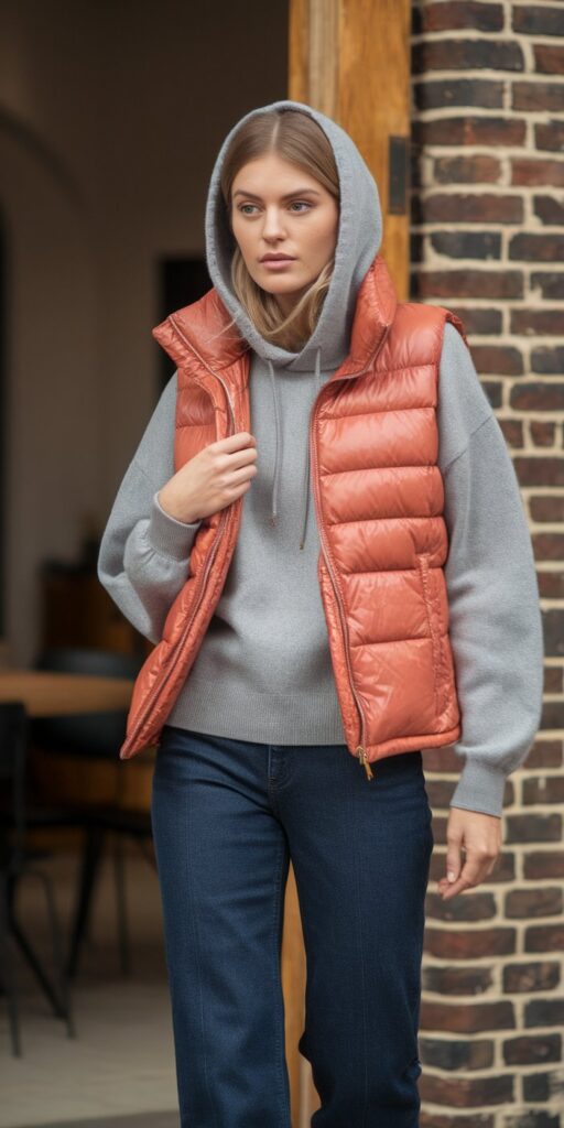 This sophisticated winter ensemble combines comfort with elevated style through strategic layering. The puffer vest adds warmth without restricting movement, while the cashmere hoodie brings luxury to casual wear.