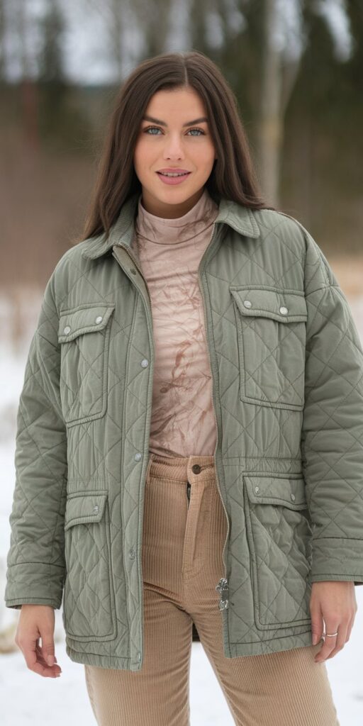 Quilted jackets create the perfect foundation for layered winter looks when paired with sleek mock neck tops and textured corduroy pants.